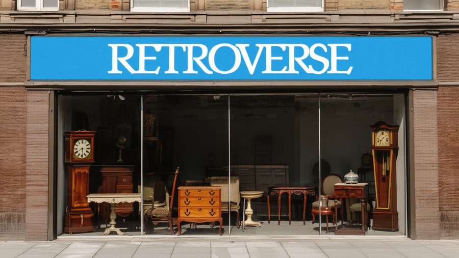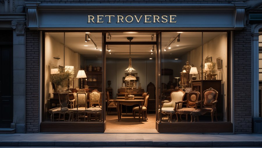 /imagine prompt: A realistic photo of the Retroverse store on the street, showing the «Retroverse» (with white serif letters) store sign and a glass display window behind which various vintage items are displayed: tables, chairs, clocks, and a chest of drawers. Also make a nighttime version of the store.