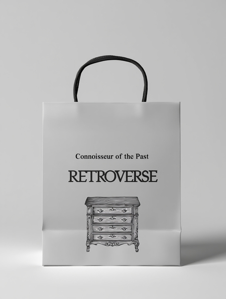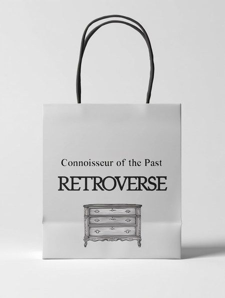 /imagine prompt: a mockup of a shopping bag for the «Retroverse» vintage furniture fair. The inscription «Connoisseur of the Past» should be located at the top of the shopper and have an engraved-style illustration of an antique table at the bottom. The shopping bag should be placed on a light gray background. Use the same brand’s serif font and black and white colors.