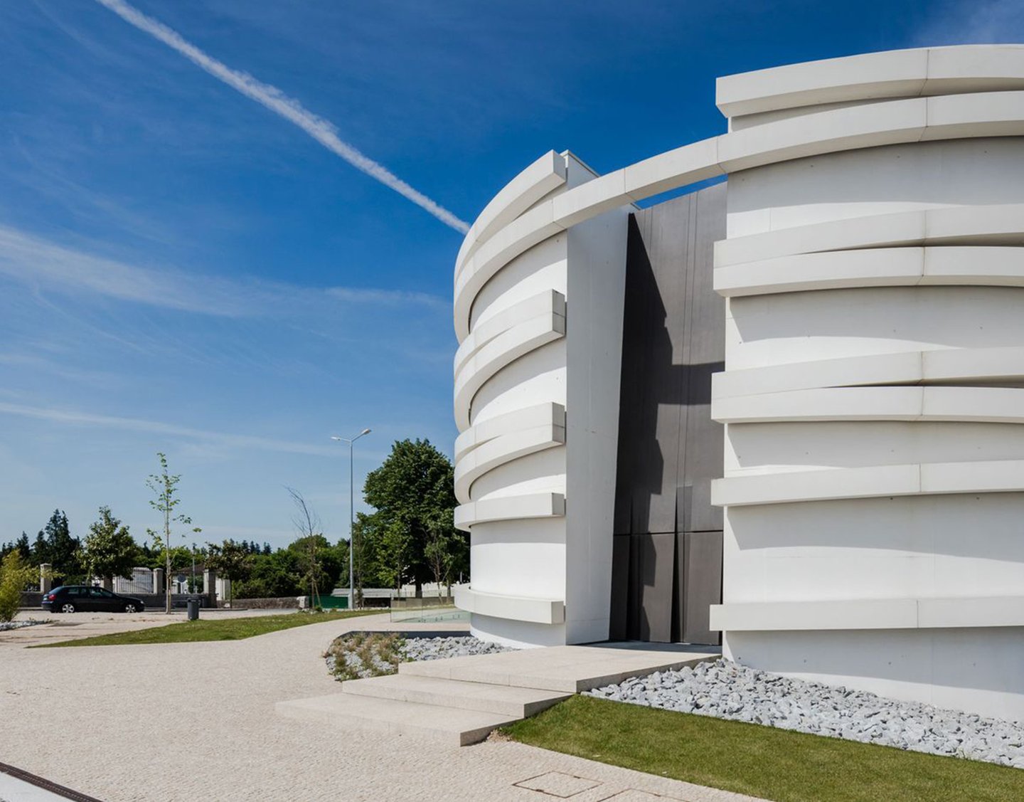 Здание выполнено в форме уплотнённого спирального объёма, замкнутого вокруг пустоты, — архитектурного символа вечности и бесконечного движения духа. Эта архитектурная интенция отчётливо проявляется в кольцевых выступах фасада, которые, словно энергетические потоки, обвивают тело церкви, подчёркивая её динамическую природу и вневременное существование. Центральный вход оформлен в виде массивного черного портала, в структуре которого прочитывается крест, воплощённый не как образ, а как пространственный разрез — отсутствие, пустота, становящаяся смыслом. Контраст между белизной фасадов и чёрным порталом отсылает к оппозиции света и тьмы, плоти и духа, земного и божественного. Это пространство не столько «рассказывает» о вере, сколько «внедряет» её в тело посетителя — через масштаб, геометрию и свет.