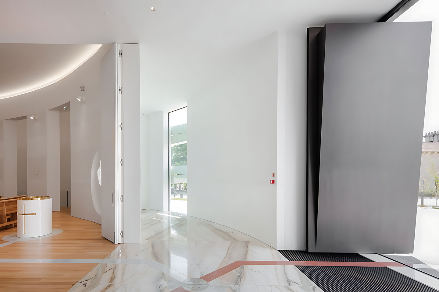 Минимализм фасада, лишённый декоративных излишеств, отсылает к идеалу архитектурной честности, где каждая линия служит смыслу. В этом храме пространство — не декорация, а действие, не фон, а участник литургии. Его геометрия — инструмент созерцания, его свет — материал откровения.
