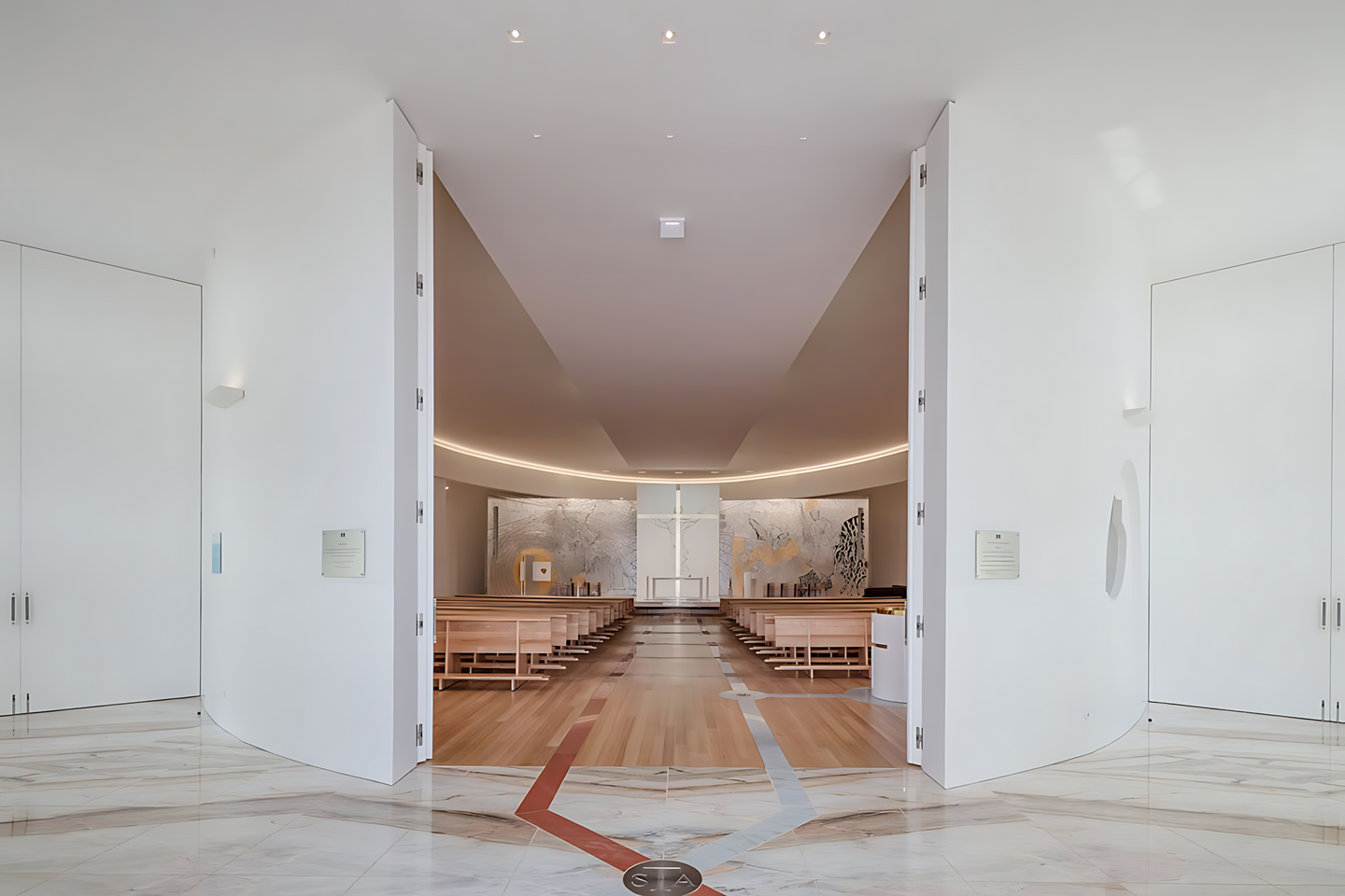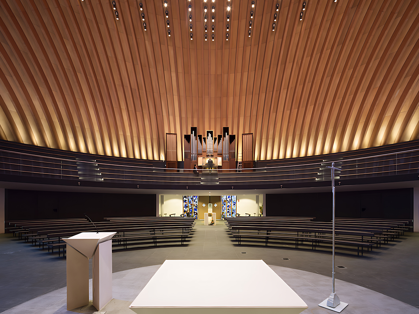 Алтарная зона представляет собой яркий пример модернистского переосмысления сакрального пространства, где архитектурная строгость сочетается с выразительной пластикой. Алтарь располагается в просторном, геометрически лаконичном пространстве, где минимализм форм служит усилению сакральности. Ключевым элементом композиции становится ясная пространственная иерархия, в которой алтарь выделен не столько декоративными элементами, сколько масштабом и пропорциями окружающего объёма. Высокие, почти парящие своды и строгие линии стен направляют взгляд к алтарю, который становится центром притяжения.