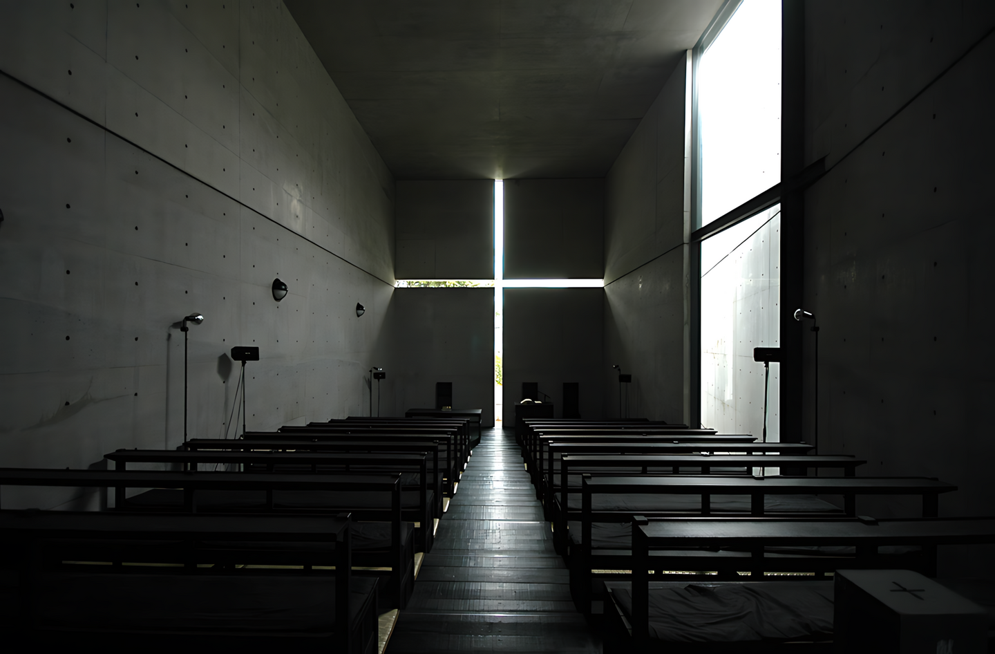 Вместо нарратива — ритм конструктивных модулей. Вместо орнамента — тектоническая ясность. Иерархическая структура уступает место открытости и внутренней направленности. Эти здания можно назвать машинами для молитвы не иронично, а в подлинном смысле: они не просто обслуживают ритуал, а формируют особое восприятие, создают тишину и настраивают на внутреннюю работу. Их духовность не навязана, она прорастает из самой архитектурной ткани. Бетонные стены, массивные балки, приглушённый свет становятся посредниками между телесным и трансцендентным. Технические средства в этом контексте не противостоят сакральному, а становятся его современной средой.
