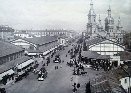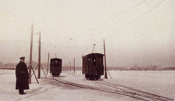 Примеры работ К. Булла, слева — Трамвай едет по льду Невы в Петербурге около 1900 г., справа — Сенная площадь, около 1900 г.