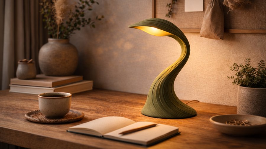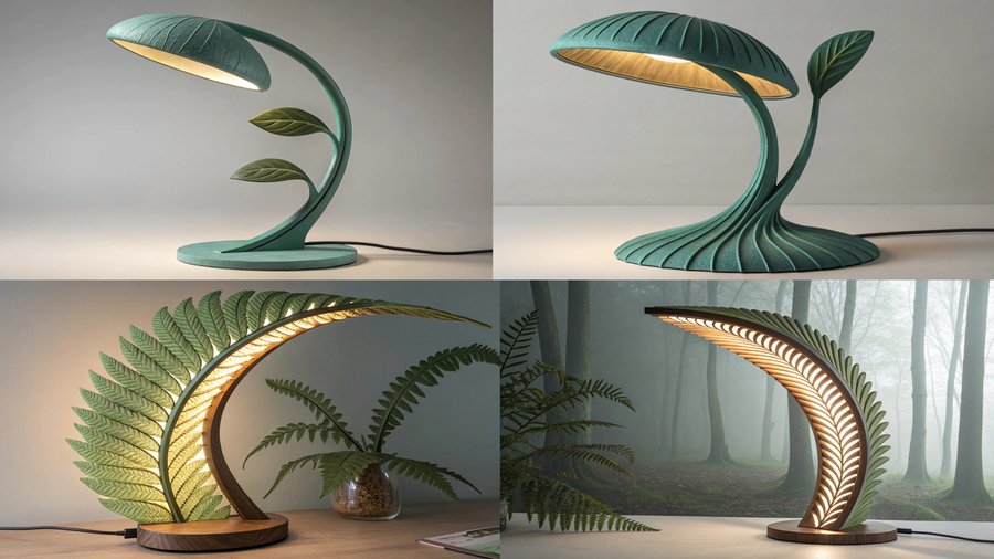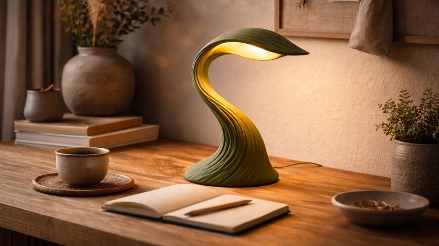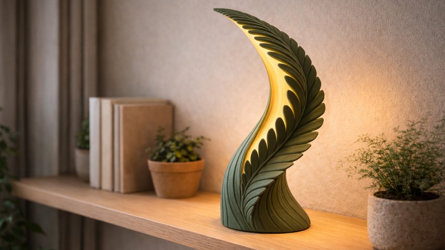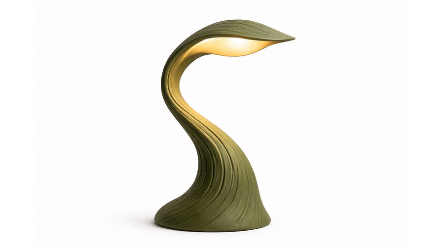 Особенности формы: Форма построена на плавном S-образном изгибе, напоминающем росток, пробивающийся из почвы. Основание широкое и устойчивое, постепенно сужающееся кверху. По корпусу — мягкие продольные рёбра, подчёркивающие направление роста. Верхняя часть вытянута и нависает над источником света, формируя естественный световой козырёк. Внутренняя полость предназначена для установки LED-модуля или лампы с рассеивателем.