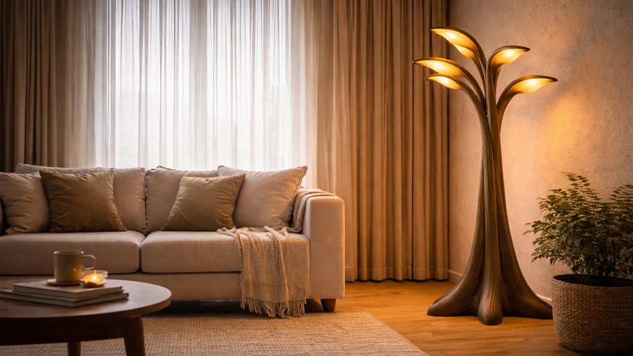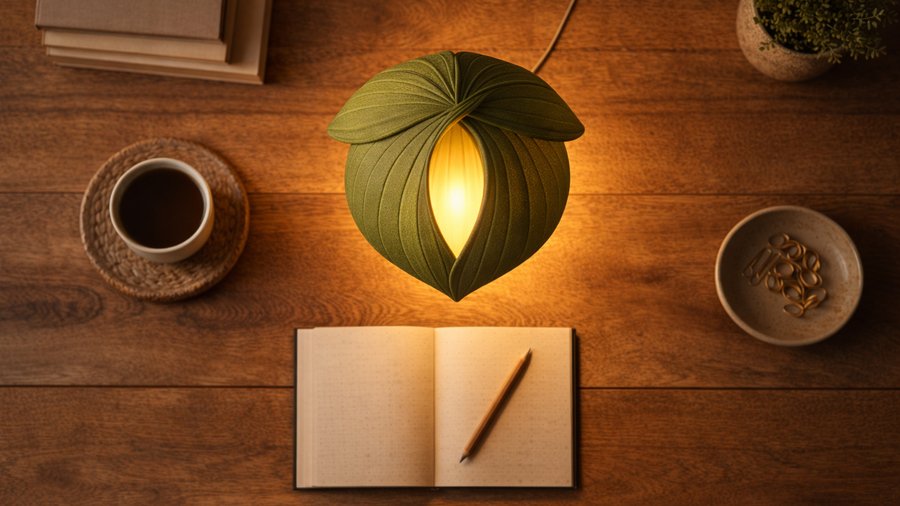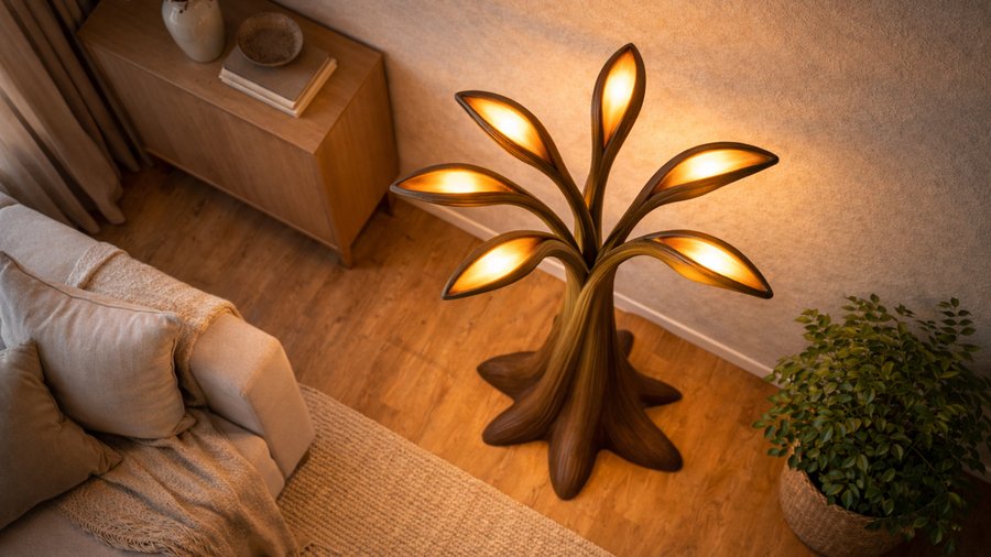 Форма светильника построена на плавном S-образном изгибе, напоминающем момент, когда росток пробивается из земли и тянется к свету. Мягкие линии и постепенное расширение основания создают ощущение естественного роста и устойчивости, а направленный тёплый свет подчёркивает образ живого, развивающегося организма.