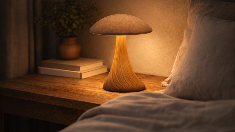 Светильник имеет компактную, устойчивую форму с мягко раскрывающейся верхней частью, отсылающей к силуэту лесного гриба. Закруглённые линии и плавные переходы создают ощущение спокойствия и защищённости, а рассеянный свет формирует мягкую атмосферу, характерную для лесной подстилки.