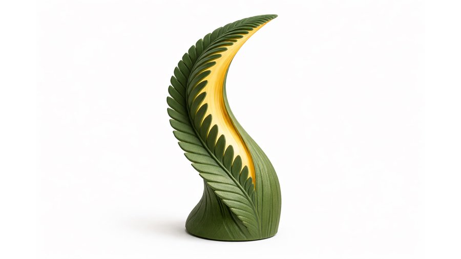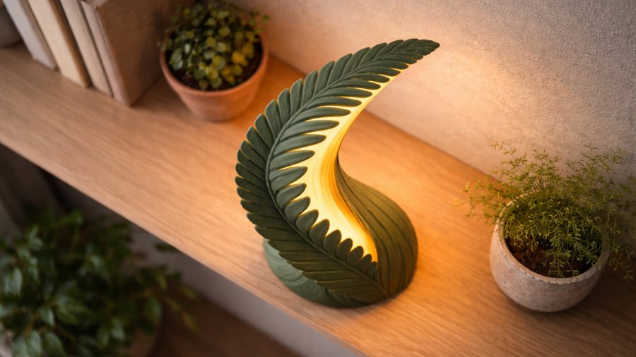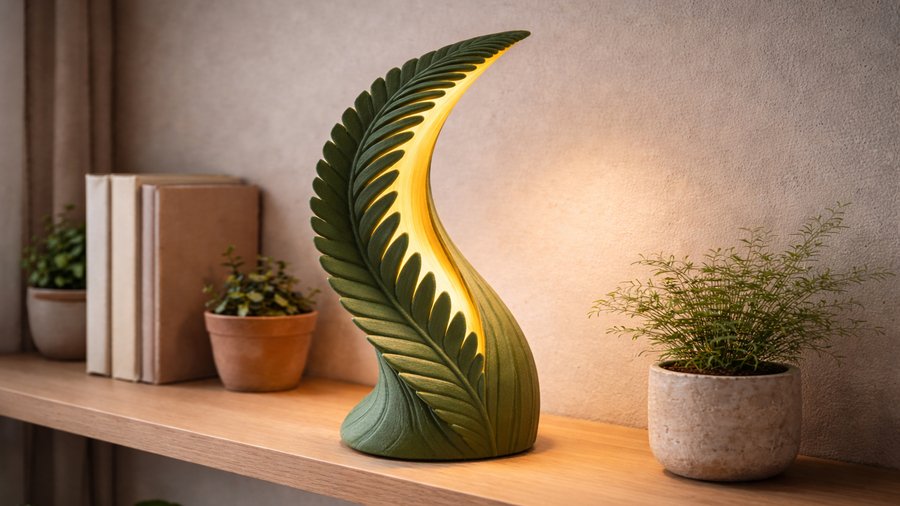 Особенности формы: Вытянутая асимметричная форма, основанная на изгибе листа папоротника. Корпус слегка наклонён, создавая ощущение движения. Продольные рёбра повторяют ритм листовой структуры. Свет направлен вдоль внутреннего изгиба формы, подчёркивая её геометрию.