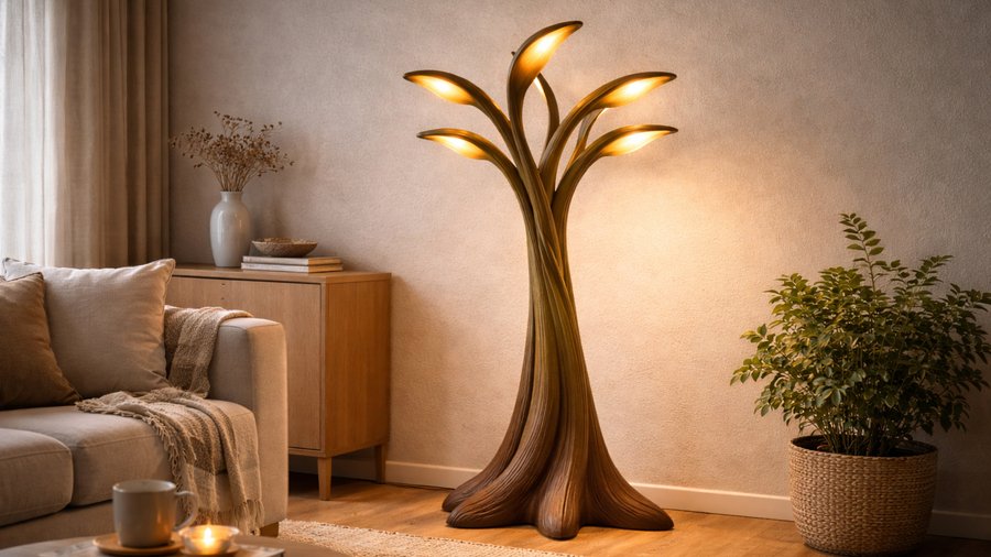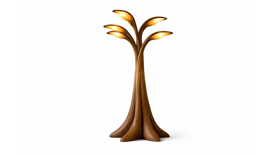 Особенности формы: Форма основана на массивном основании, от которого вверх поднимается вытянутая органическая структура. Силуэт асимметричен, с плавными ответвлениями, напоминающими корни дерева. Основная масса сосредоточена внизу, что обеспечивает устойчивость. Источник света скрыт в верхней части и даёт рассеянное отражённое освещение.