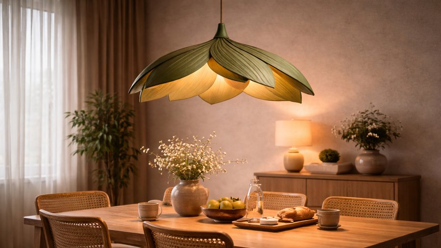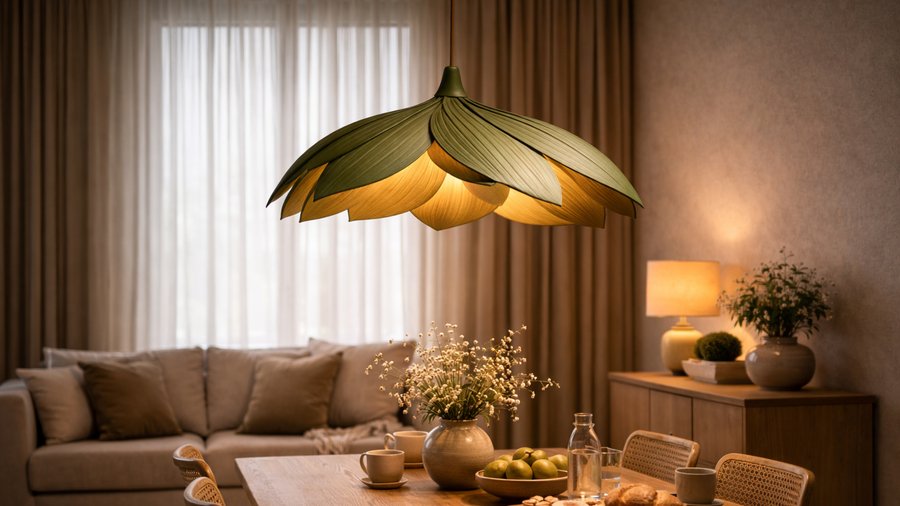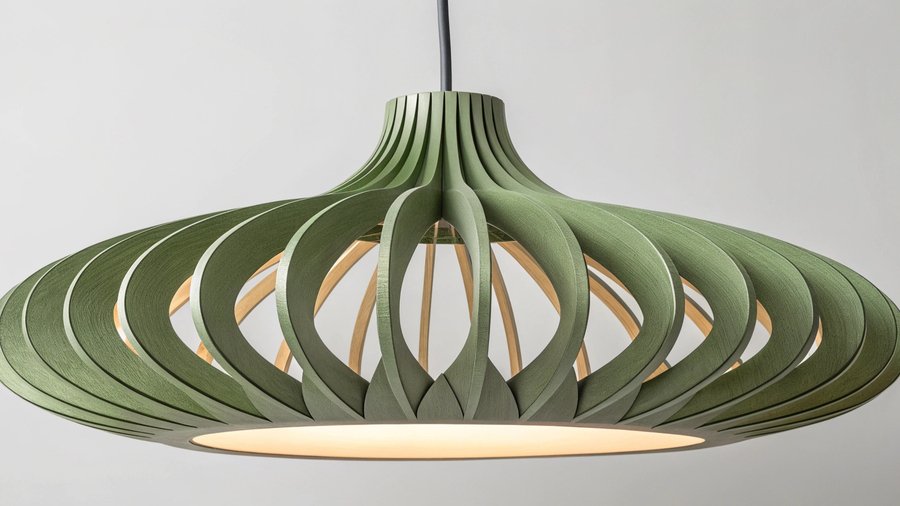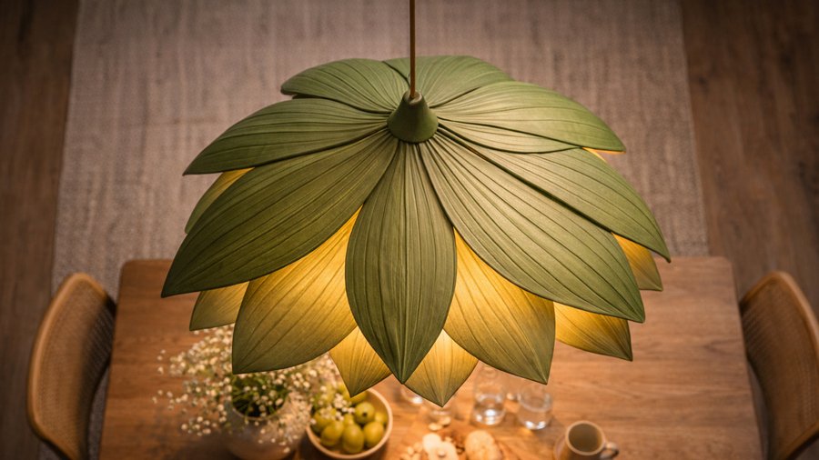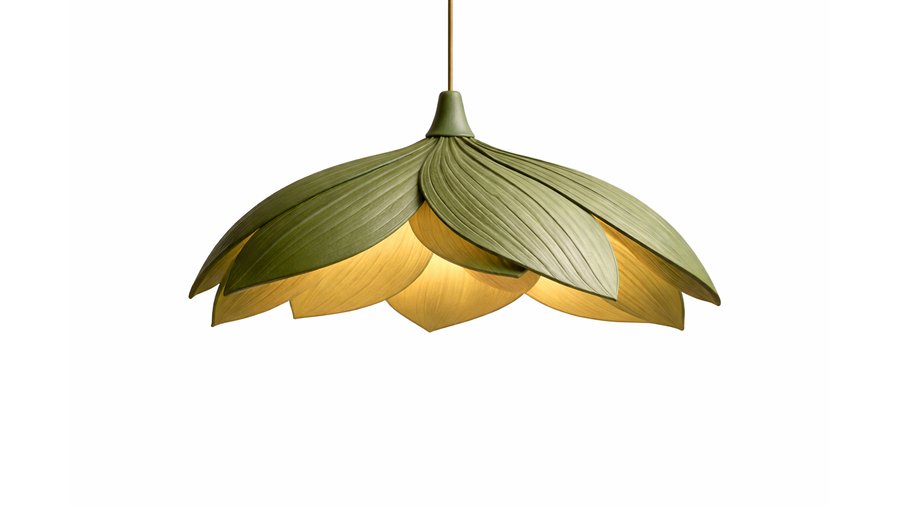 Особенности формы: Форма напоминает нависающий лист или крону дерева. Корпус тонкостенный, с выраженными слоями, подчёркивающими направление формы. Свет направлен вниз, создавая мягкое локальное освещение. Конструкция рассчитана на подвес с кабелем по центру.