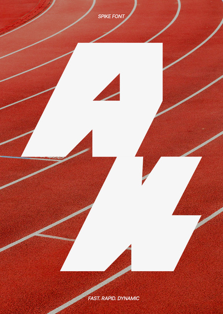 SPIKE — акцидентный шрифт из заглавных букв, поддерживающий латиницу и кириллицу. Вдохновлён эстетикой лёгкой атлетики, он передаёт ощущение скорости, силы и соревновательного напряжения.