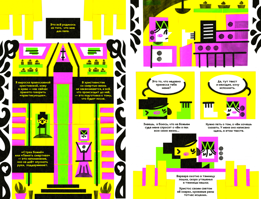 «Святая Варвара» — это комикс-репортаж об исполнительнице старинной и фольклорной музыки, солистке ансамбля «Сирин» и руководительнице коллективов «Узорика» и «Горожане» — Варваре Котовой.