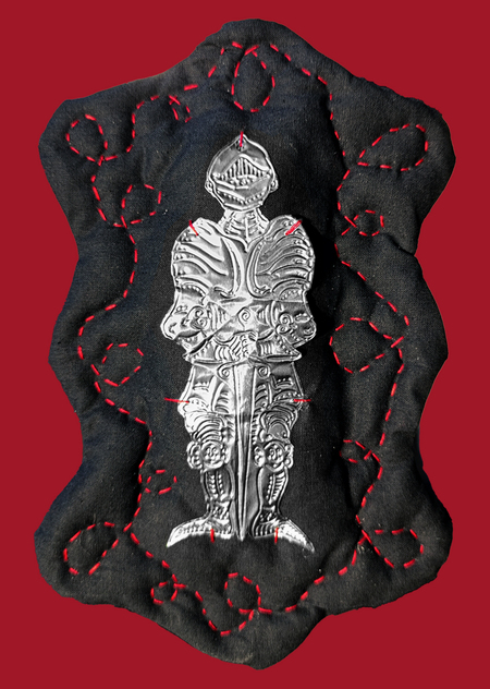 «Артуриана» — серия тактильных иллюстраций по мотивам легенд о короле Артуре. На объёмных тканевых основах вышиты узоры, а центральные элементы из фольги представляют ключевые образы артуровских мифов. Металлические фигуры напоминают древние реликвии, а красная нить выступает метафорой судьбы и времени, связывая все легенды в единую линию повествования.