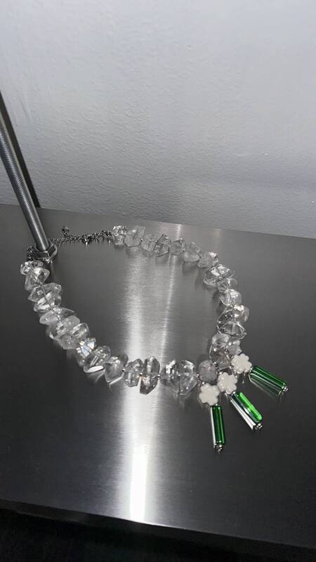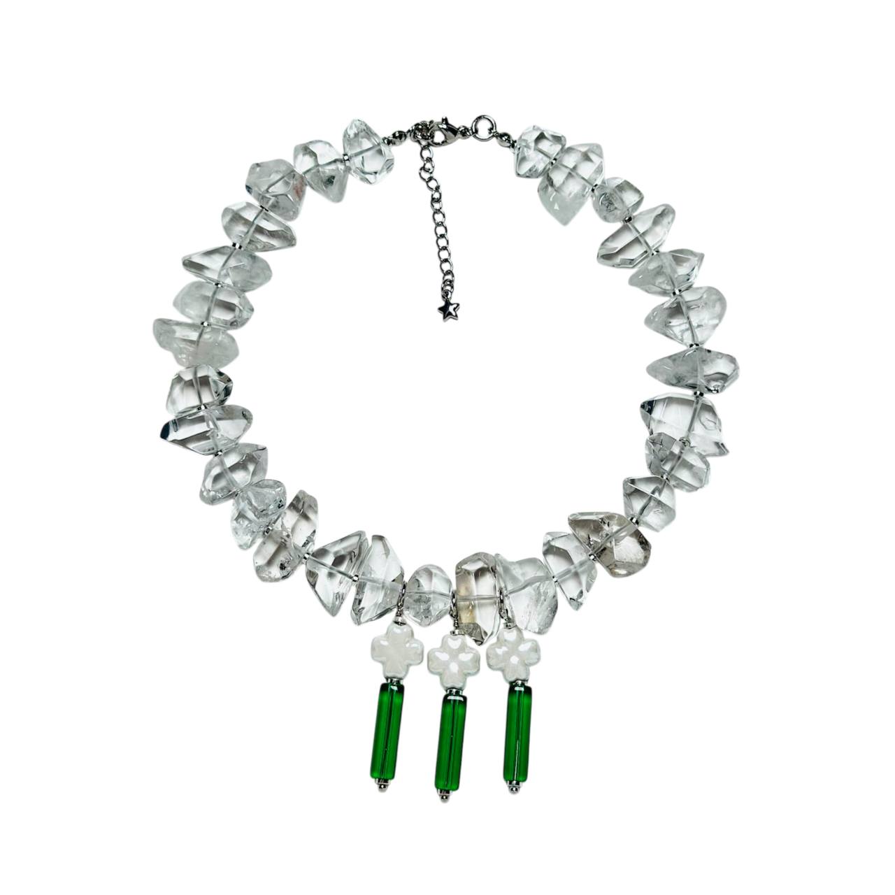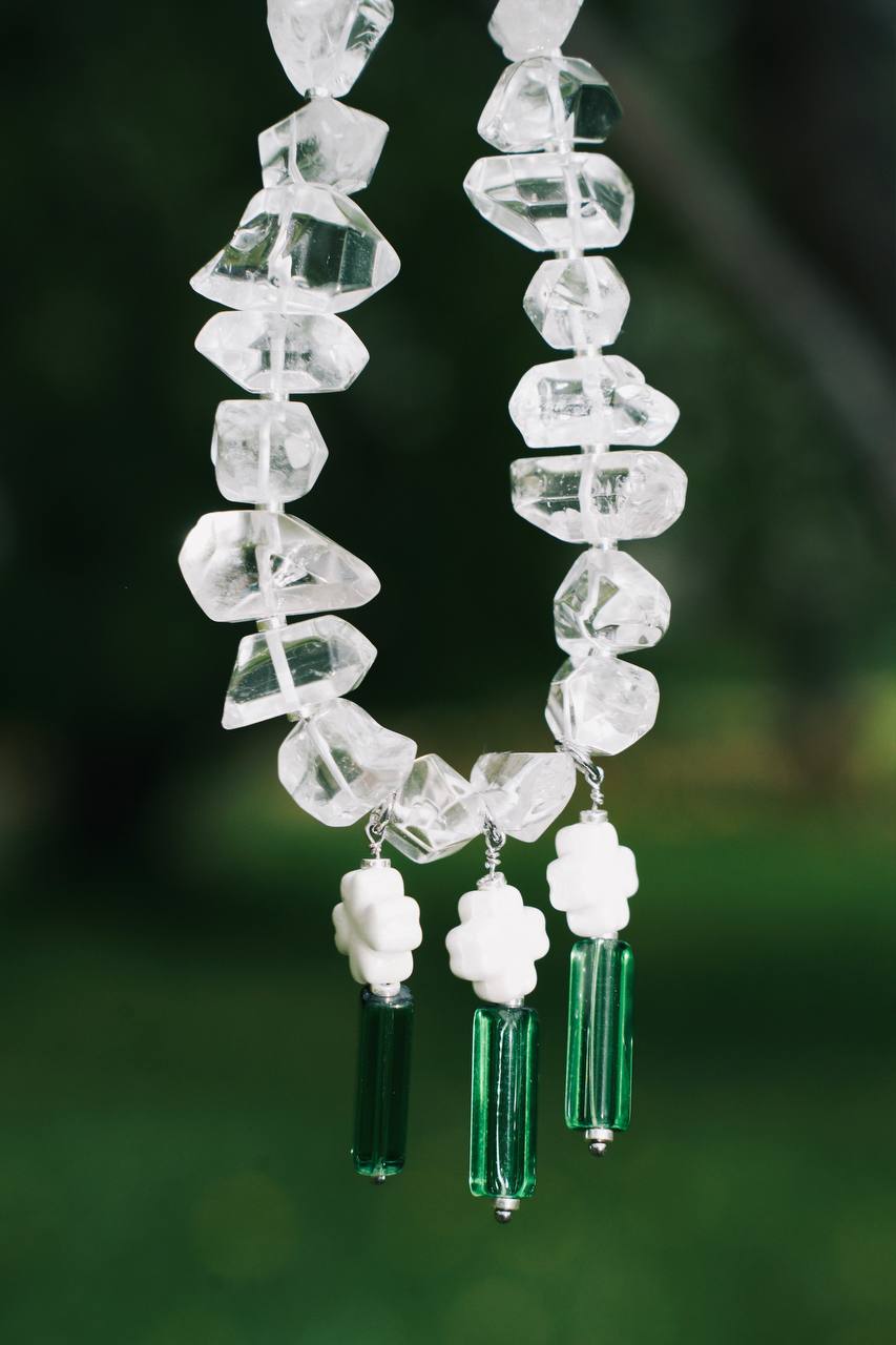 Материалы: ювелирный трос, речной жемчуг, кварц, ювелирное стекло, керамика, гематит, фурнитура родий,