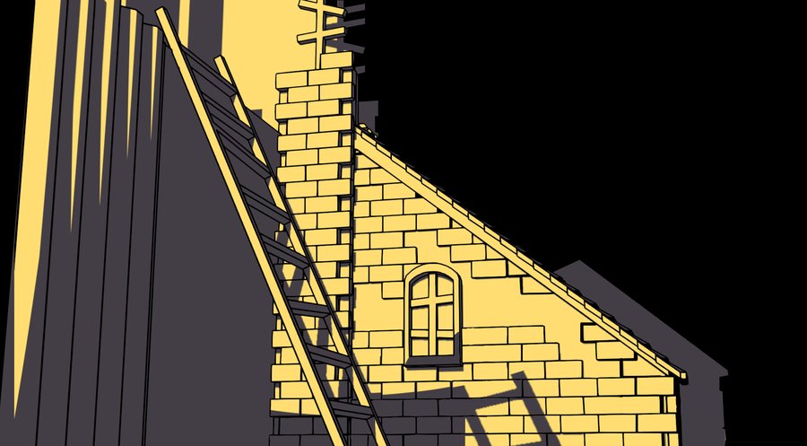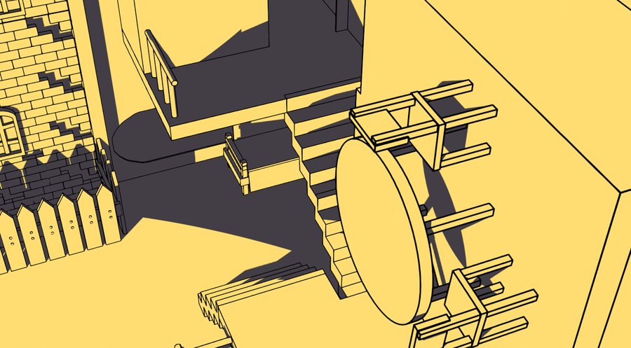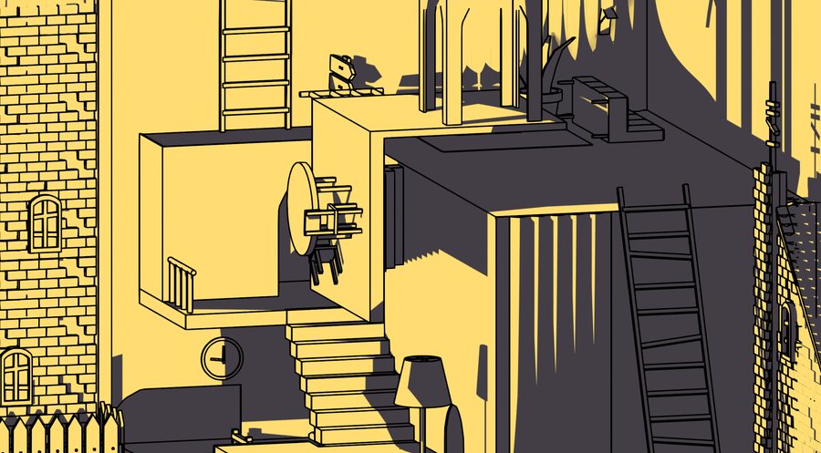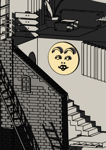 Жёлтый свет и голубые тени создают атмосферу сна и сюрреализма, а двумерная обводка стирает границы между плоским и объёмным. Пространство становится визуальной метафорой дезориентации и поиска опоры в меняющемся мире.