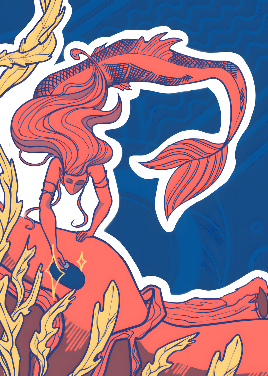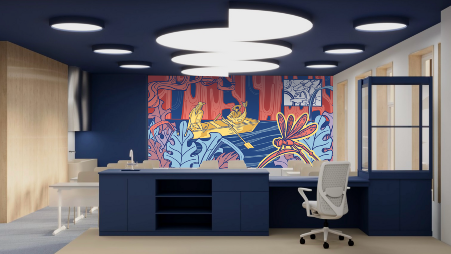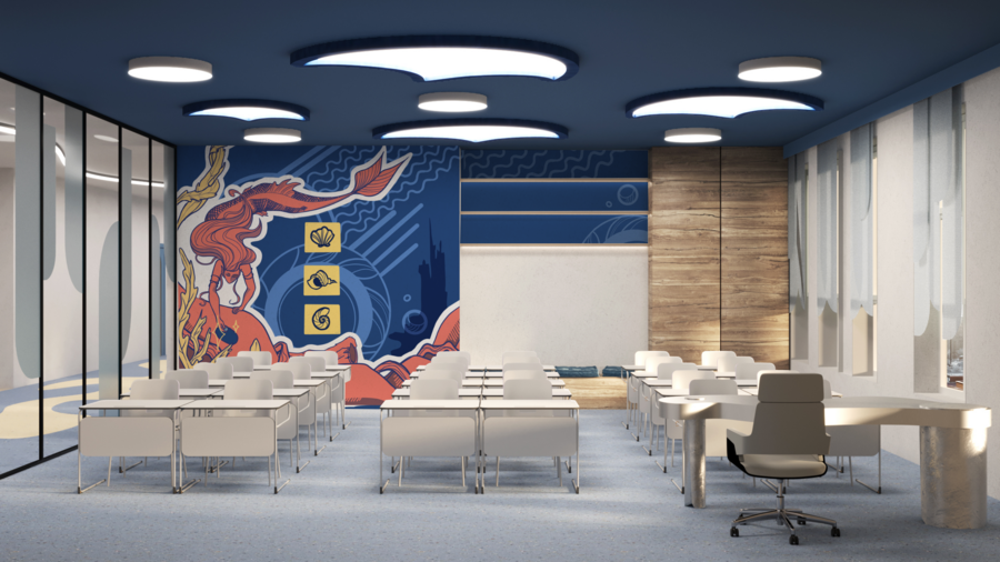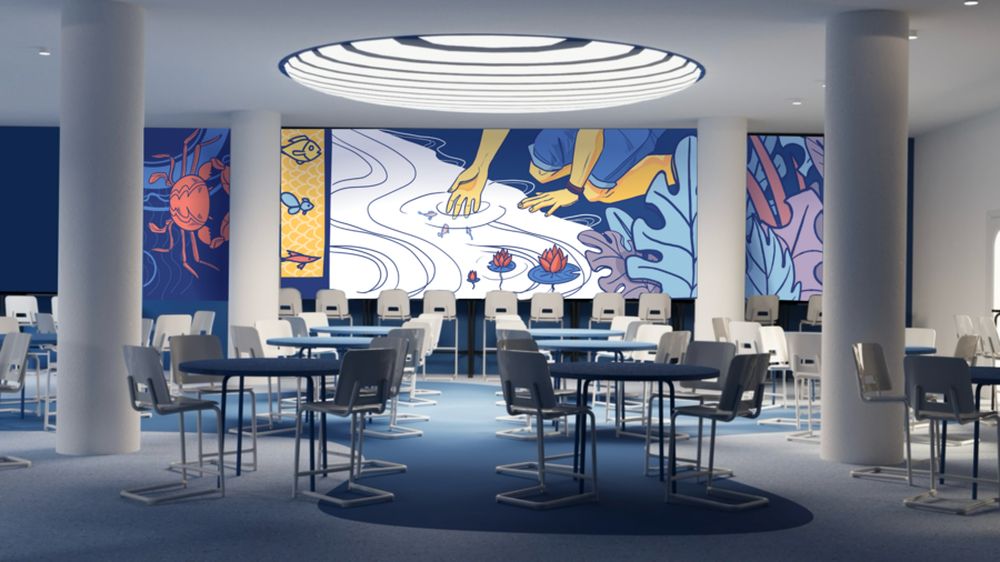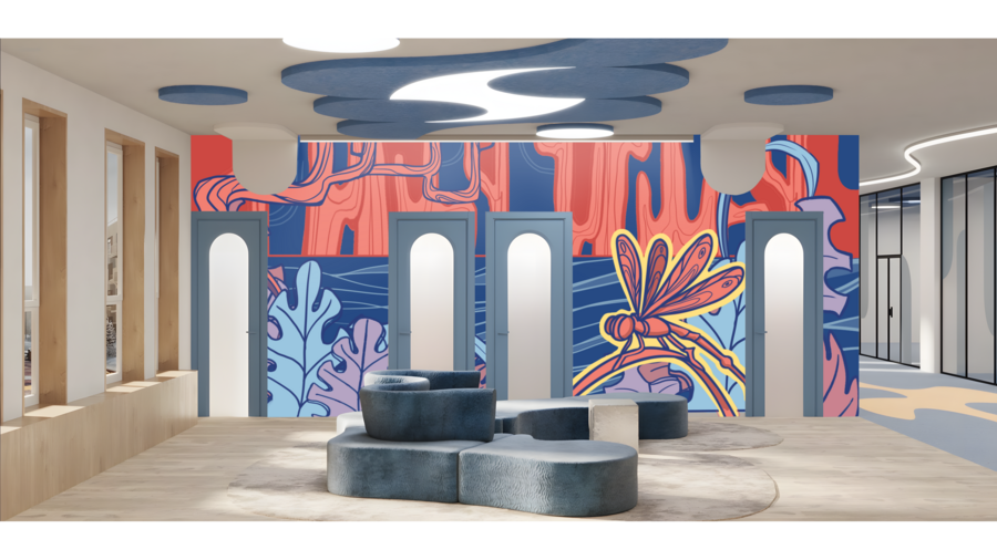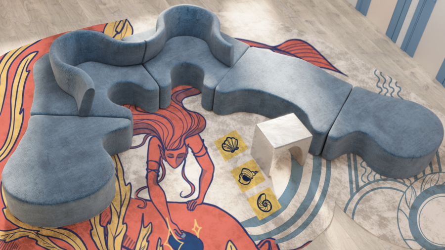 Иллюстрации зоны отдыха были вдохновлены формами окружающих предметов, таких как кресла, напоминающие водопады, или круглые ковры, на которых устроилась русалка.