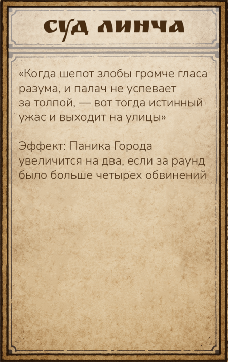 Оправдание: снимает жетоны Подозрения с других. Уменьшает Шкалу Паники Города на −1.