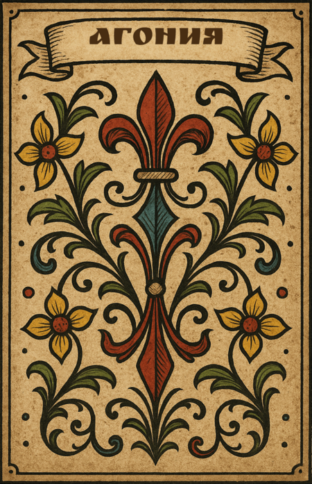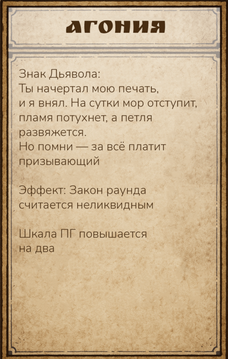 Агония — разыгрываемые карты действия из колоды, неожиданно влияющие на раунд. Могут играться и как отдельные карты действий в ячейках, а могут накладывать свойства поверх разыгранной карты обвинения/оправдания. Однако будьте осторожны, они часто сильно увеличивают Шкалу Паники Города.
