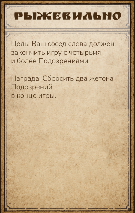 В начале игры вы получаете секретную карту Личной Цели. Ей не обязательно следовать, но выполненная цель избавит вас от 2 жетонов Подозрений в конце игры.