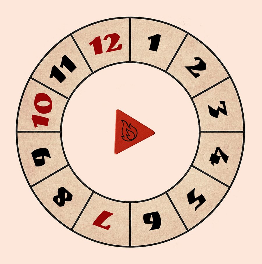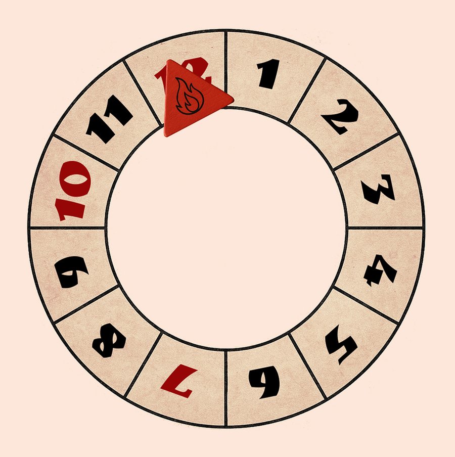 Игра длится 7 раундов: по дням в неделю. В конце каждого дня жители бросают фишку Хвороста в костер, готовя его к судной ночи.