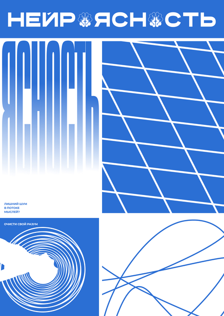 «Нейроясность» — это сервис, который помогает переработать негативные мысли и снизить уровень стресса. Анимированный вэб‑плакат показывает, как хаотичные мысли постепенно упорядочиваются и успокаиваются, переводя зрителя от внутреннего шума к ощущению ясности и опоры. Через визуальные образы и движение он помогает почувствовать эффект сервиса ещё до регистрации.
