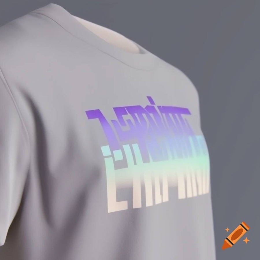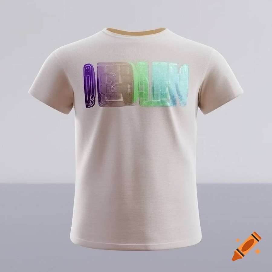 Promt: generate a media with a t-shirt that has a print with the name «Crystal Symphony» in purple, light green, light blue, and beigеж