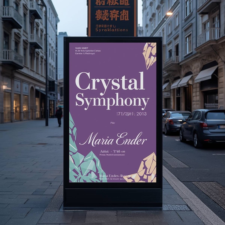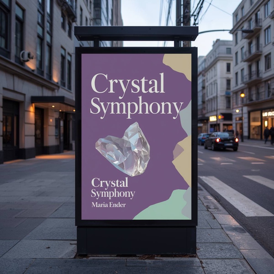 Promt: Create minimalist advertising posters on the streets for Maria Ender’s exhibition called «Crystal Symphony,» using purple, light green, light blue, and beige colors.