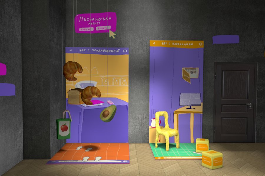 Проект Вадима Ревина «Было на самом деле» посвящен «эффекту Манделы» — неконтролируемым искажениям коллективной памяти и тому, как порой неточно мы видим исторический процесс, доверяясь информации в медиа и расхожим мнениям. В то же время инсталляция Полины Малевой «Выйди и войди в чат нормально» исследует новые формы общения в эпоху цифровизации, когда молодым людям комфортнее общаться в сети, а «живое» общение зачастую становится травмирующим. Работа показывает изменившуюся гибридную коммуникацию, которая может примирить традицонные формы общения и цифровые. В свою очередь, работы Александры Горяиновой визуализируют влияние цифровой среды на чрезмерно упрощенное видение человека, показывая, как индивидуальность может теряться в потоке информации, становясь лишь набором данных.