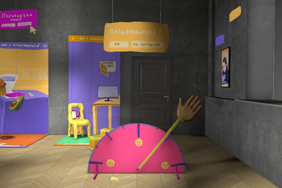 Пространство инсталляции представляет собой набор сцен-ситуаций известных каждому — встреча с соседкой в лифте, поездка в общественном транспорте или поход в магазин. Эти сцены функционируют как смесь физического и цифрового пространств и активируются посредством перформанса, реализующегося как читка вымышленной пьессы о трудностях коммуникации.