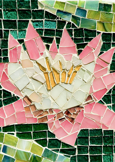 «Лотос» — мозаика из различного вида стекла размером 20×20 см, изображающая прекрасный бело-розовый цветок в водоеме с кувшинками.