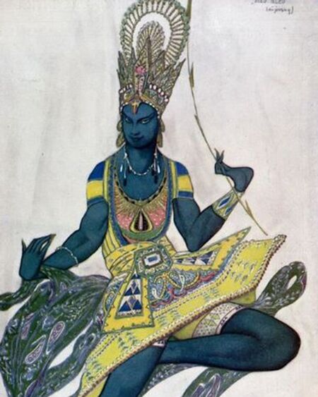 Вацлав Нижинский в роли Синего бога в сцене балета «Синий бог». 1910-е годы. / Леон Бакст. Эскиз костюма к балету «Синий бог» (фрагмент). 1910-е.