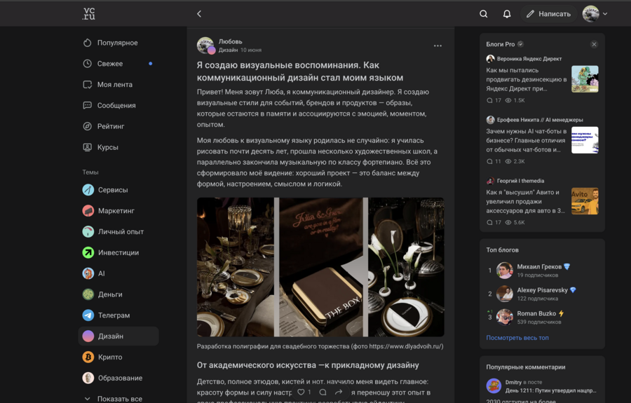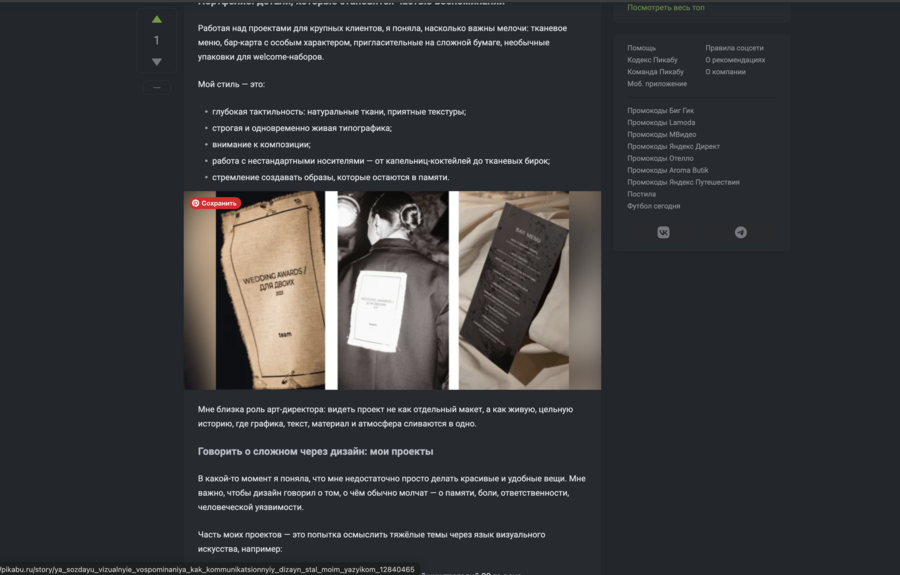— VC.ru: адаптация стиля под платформу, анализ успешных публикаций с помощью ChatGPT. Использовались промпты типа: «Проанализируй стиль заголовков и структуры популярных статей на VC.ru по теме дизайна. Какие слова чаще встречаются в топе? Как они оформлены?» Это помогло выстроить текст более убедительно. — Pikabu: формат адаптирован под личный рассказ, но не хватило встроенности в дискуссию. С помощью ИИ я могла бы сгенерировать комментарии для вовлечения. Пример промпта: «Ты — активный пользователь Pikabu. Придумай 5 комментариев к посту о визуальной памяти в дизайне, которые вызовут обсуждение или поддержку.» — Задача на будущее: использовать ИИ для генерации реплик, работать с вовлечением как с отдельной задачей: что будет первой реакцией? Как продолжить диалог?