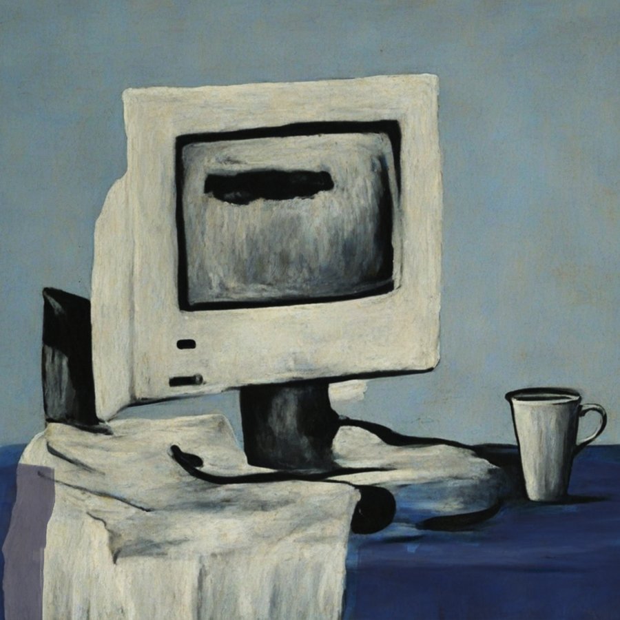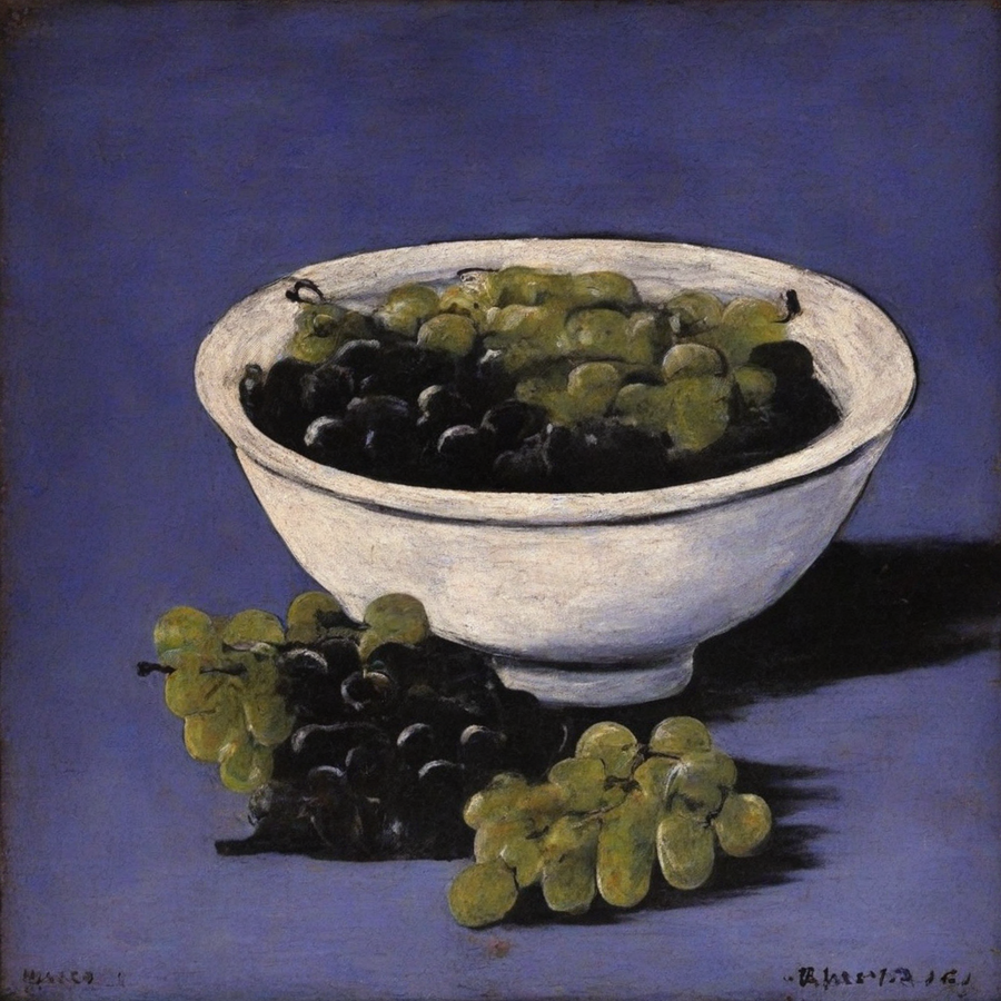 Я решила начать с чего-то простого — небольших бытовых натюрмортов в заданной гамме. Модель справилась хорошо не только с привычным для нее предметом (виноград), но и новым — монитор компьютера.