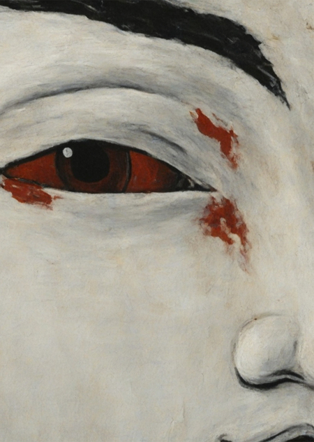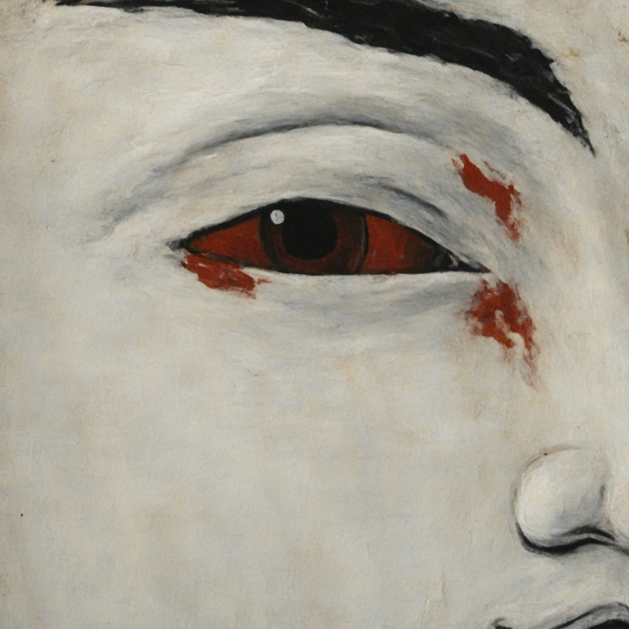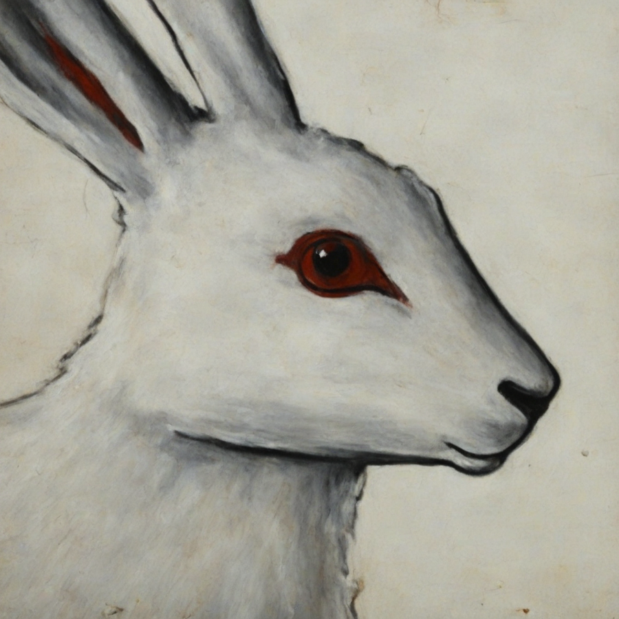 prompt: painting in PIROSMANI artsyle, close up portrait of a head of white [person/rabbit] with red eye, side profile view, solid white background