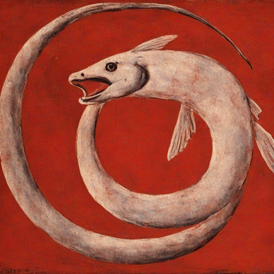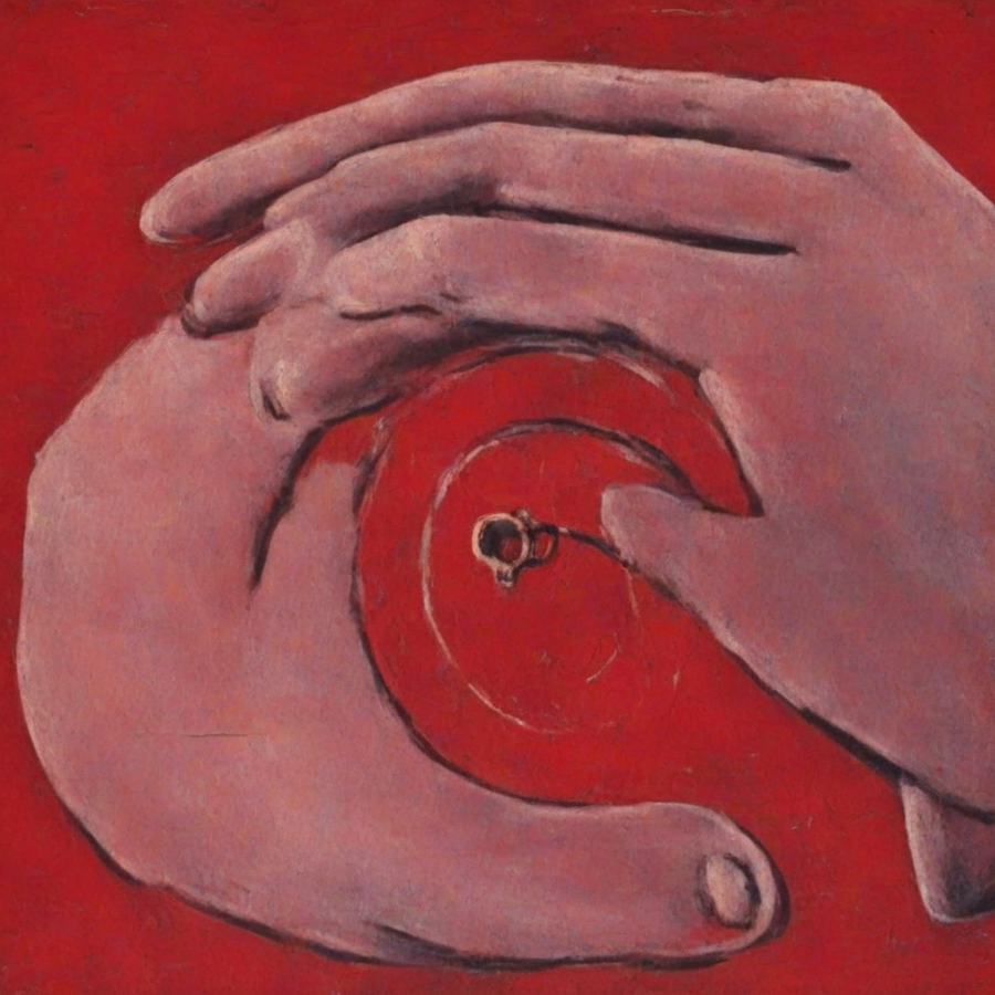prompt: painting in PIROSMANI artsyle, [snake ourobouros is biting its tail/ hands shape a circle amoung a small ring] circular composition, solid red background
