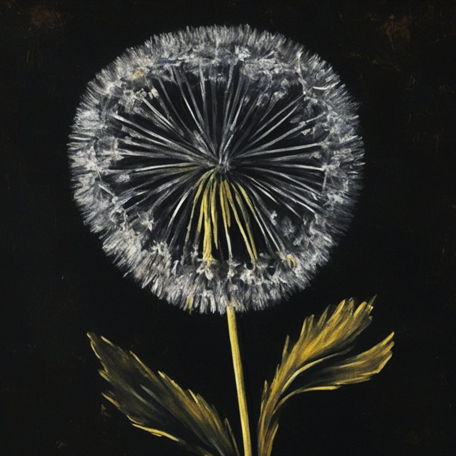 prompt: painting in PIROSMANI artsyle, round [white dandelion/clocks], black solid background, central composition, front view