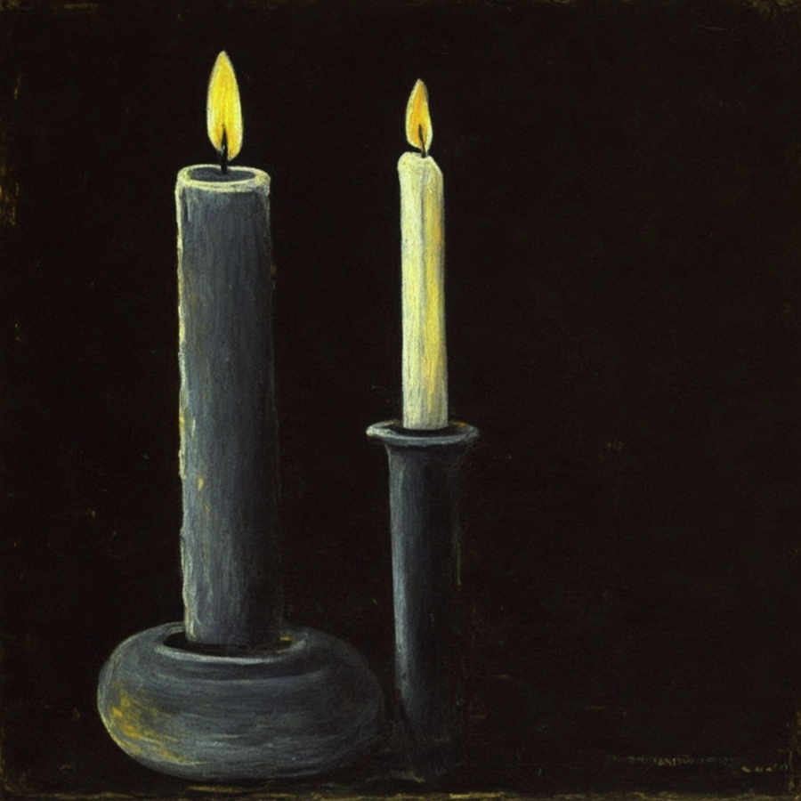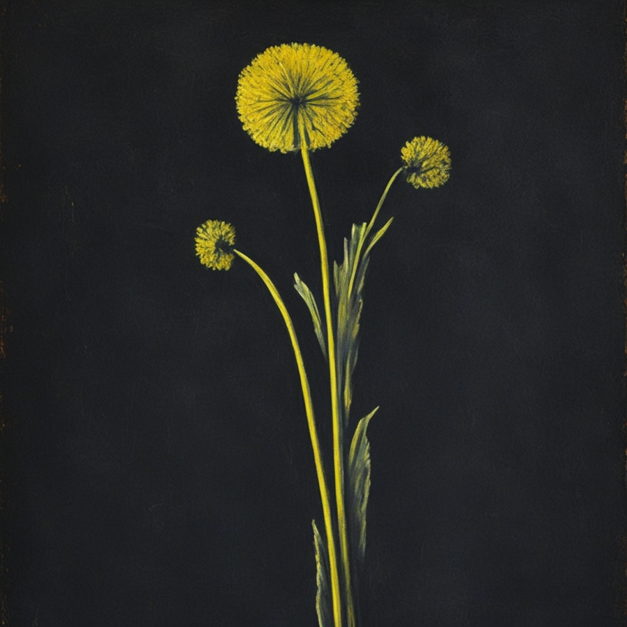 prompt: painting in PIROSMANI artsyle, still life, tall [candles/ yellow dandelions], black solid background, central composition, front view