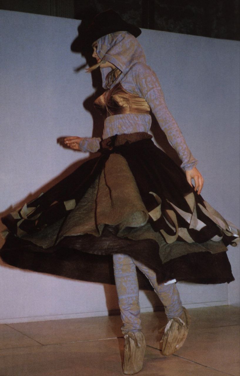 Коллекция функционирует как театр памяти и фантазии. Гальяно собирает фрагменты исторических силуэтов — от кринолина до бельевых комбинаций — и склеивает их в гротескные, завораживающие композиции. Этот подход роднит его с театральными художниками: он не репрезентирует моду, он разыгрывает её. Костюм здесь — это не одежда, а персонаж. Все приёмы, присущие театру, — экспрессия, маскарад, гипертрофия, эксцентрика — становятся инструментами модного высказывания. Galliano, как и театральный режиссёр, не боится переигрывать. Его коллекция — это комедия дель арте, мелодрама, викторианский романс и декадентский манифест в одном действии. Подиум становится сценой, на которой разыгрываются истории страсти, безумия, одиночества и желания.