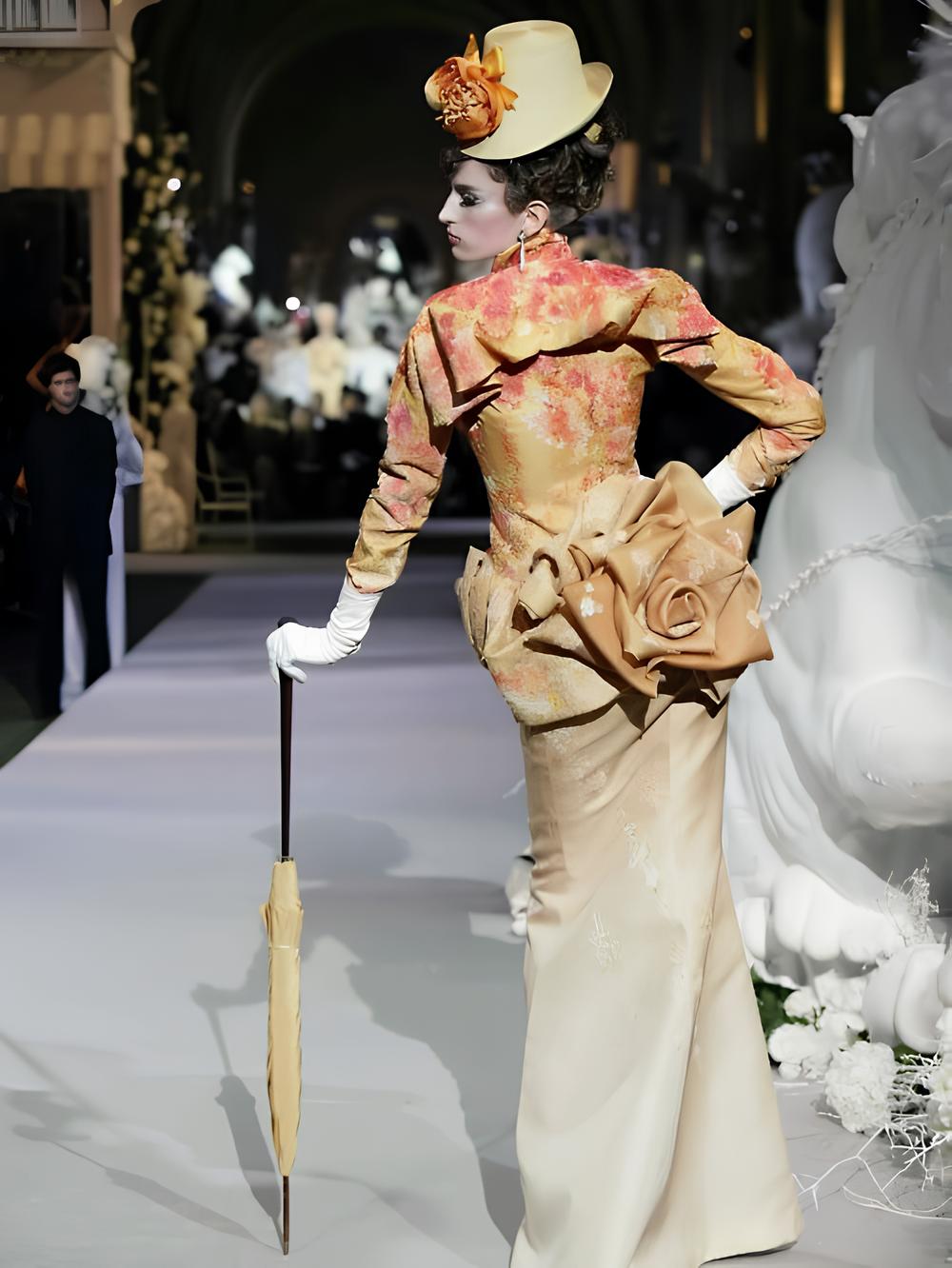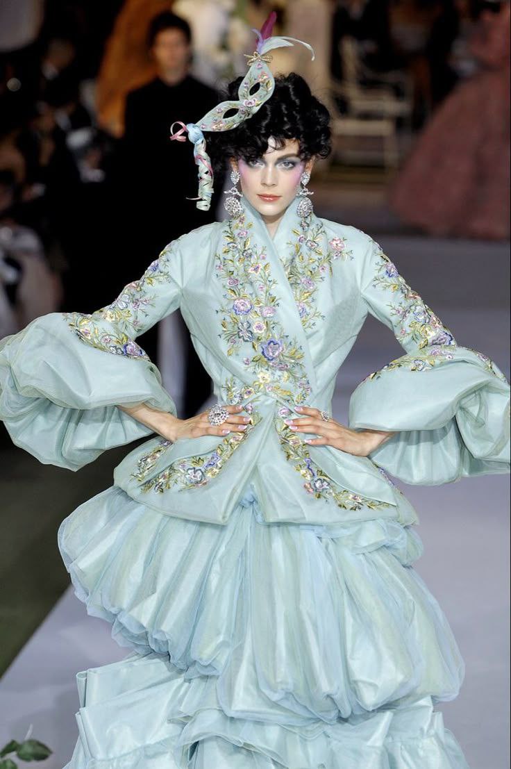 Коллекция Dior под руководством Джона Гальяно восстанавливает роскошь и театральность эпохи Людовика XIV, используя пышные формы, сложные детали и яркие цвета, характерные для французского барокко.