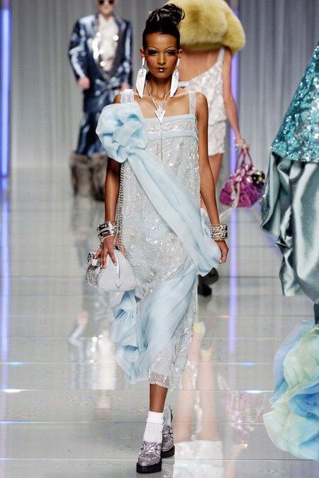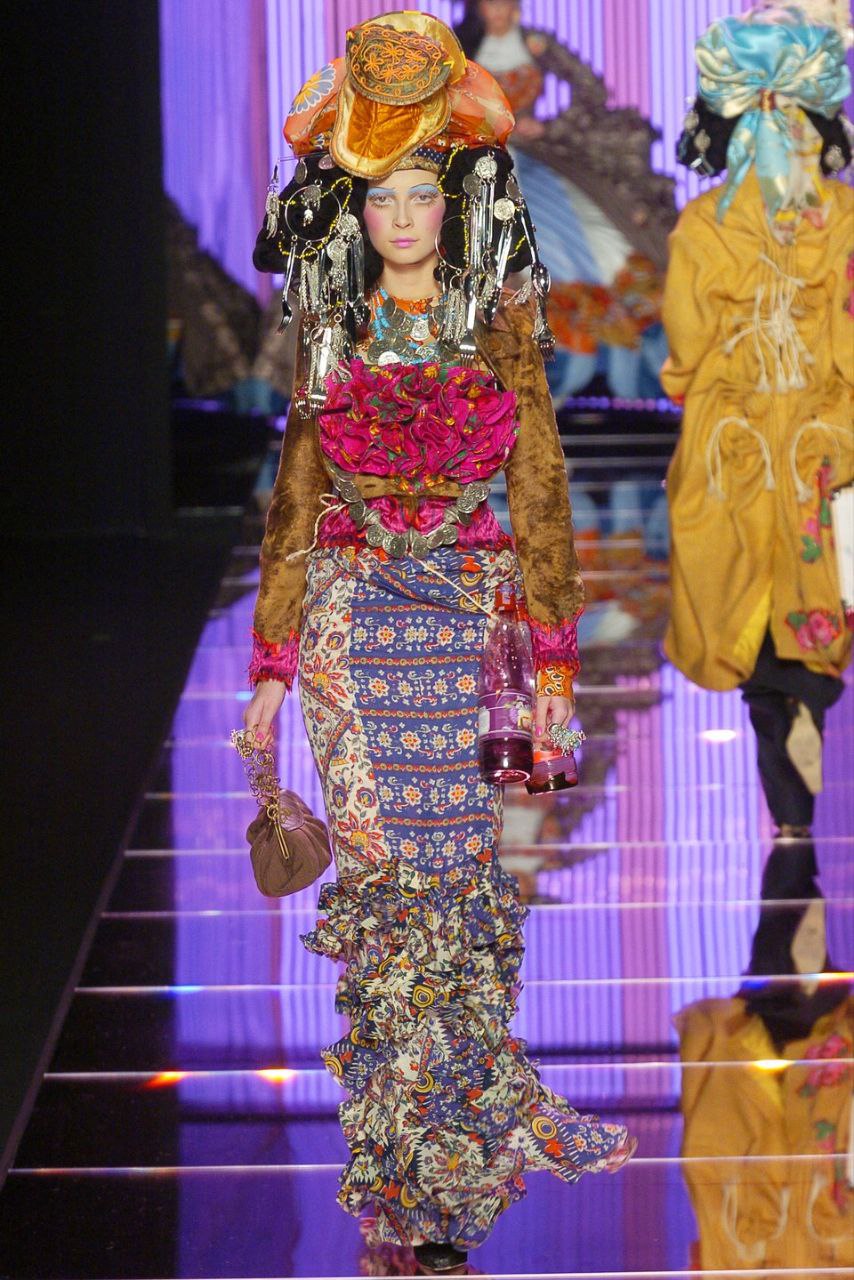 Показ Dior Осень/Зима 2004 под руководством Джона Гальяно прошёл как яркий театральный спектакль. Модели выходили на подиум в роскошных костюмах, вдохновлённых историей моды: от XVIII века до эдвардианской эпохи. Визуально и эмоционально показ напоминал костюмированную драму.