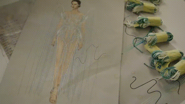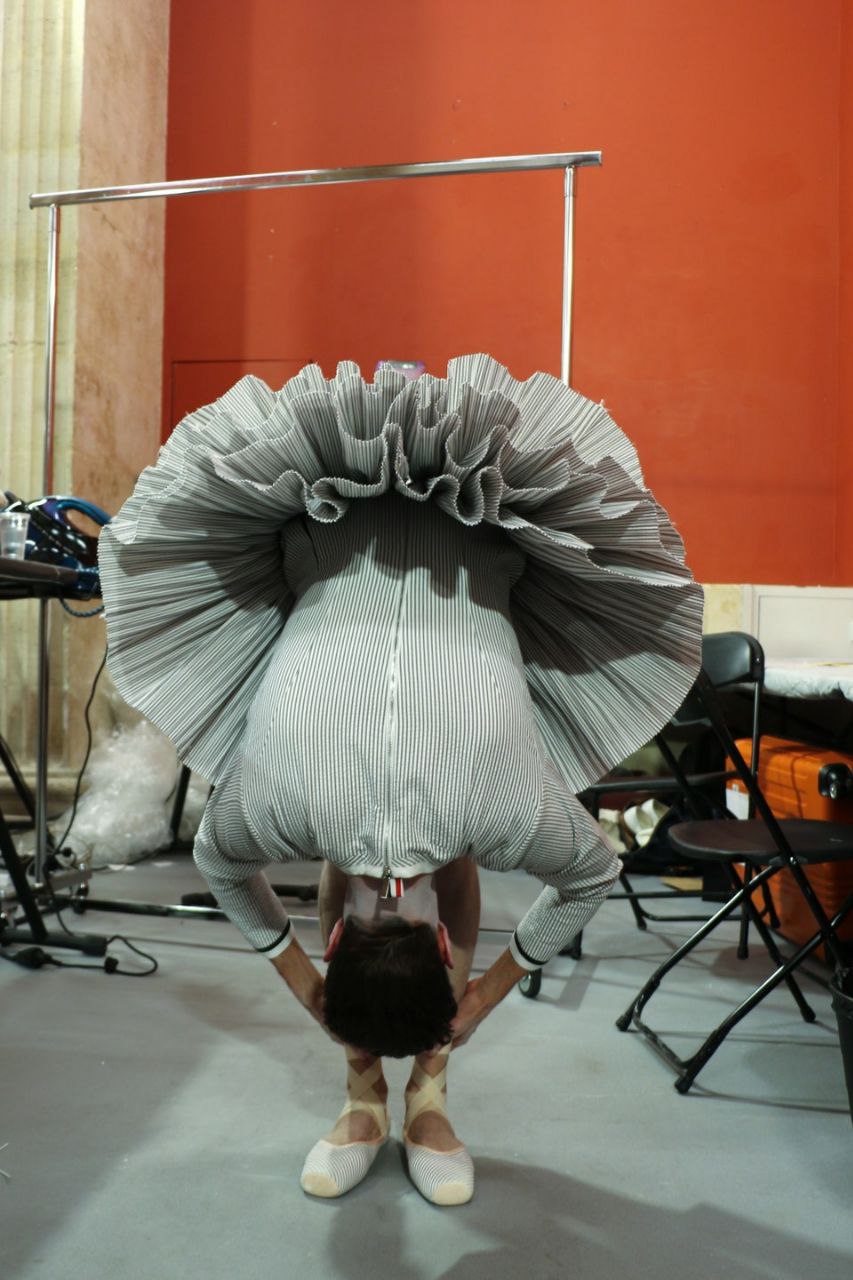 Костюмы сочетают традиционные техники haute couture — ручную вышивку, жаккард и декоративные детали — с требованиями сцены. Платье балерины адаптировано для движений танцора, сохраняя при этом эстетическую строгость и узнаваемый стиль бренда. Такой подход демонстрирует, что кутюрный дизайн может сохранять функциональность и одновременно усиливать визуальную выразительность спектакля. В костюмах четко прослеживается баланс между подиумным изяществом и сценической практичностью.
