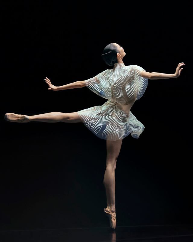 Айрис ван Херпен создала костюмы для современного балета Transmotion — высокотехнологичные, текучие формы, 3D-печать, инновационные материалы. Её костюмы словно парят вокруг тела, реагируя на движение и свет, усиливая ощущение пространства и эфемерности.