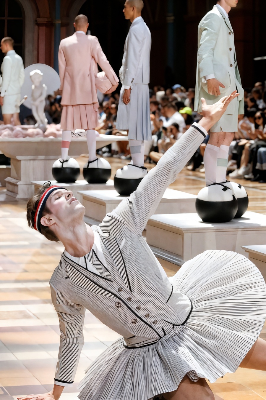Показ Thom Browne — пример интеграции театральных дисциплин в моду. Такое взаимодействие позволяет не просто усилить визуальный эффект, но создать новое сценическое пространство, где граница между подиумом и театром стирается. Это демонстрирует, как мода может выйти за рамки индустрии и стать частью сценического искусства. Здесь модный дизайнер выступает как театральный постановщик, а показ — как полноценный перформанс.