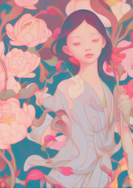 «an artwork in James Jean style, a beautiful long dark haired girl walking through garden with beautiful flowers, roses and chrysantemums»
