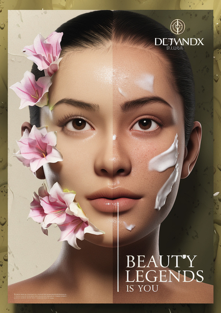 Промпт: posters with 3D images of half of a woman’s face, on which cream is applied, flowers bloom on the free areas of the face, a moss-colored background with water drops, the poster says «Beauty legends is you»