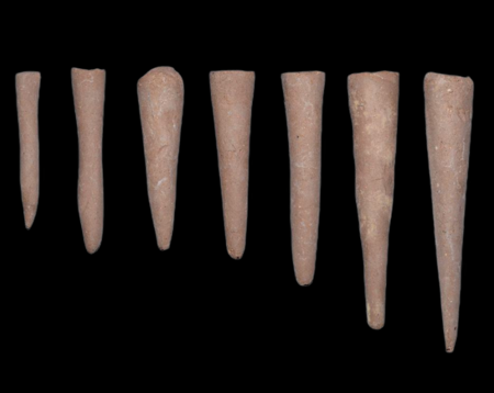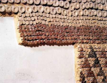 Основание мозаики — глиняные обожженные конусообразные гвоздики, шляпки которых окрашены в красный, белый и черный цвета, длиной 8-10 см и диаметром 1,8 см.