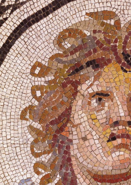 Наглядно видно, как рос уровень стилизации и детализации на мозаичных панно в античности. От упрощенных выражений лица и примитивных обозначений складок на одежде до сложного светотеневого рисунка и передачи материала одежды.