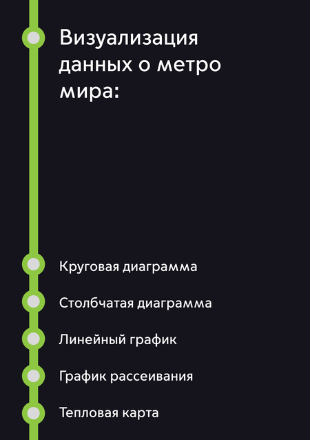 В данном проекте проведён анализ датасета о метрополитенах мира. Основная цель заключалась в выявлении закономерностей и взаимосвязей между такими показателями, как год открытия метро, протяжённость сети, количество станций, пассажиропоток, а также город, страна и регион расположения метрополитена. Для наглядного представления информации были использованы различные типы визуализаций: круговая и столбчатая диаграммы, линейный график, диаграмма рассеяния и тепловая карта. Выбор графиков определялся характером данных и стремлением наиболее чётко отразить выявленные закономерности.