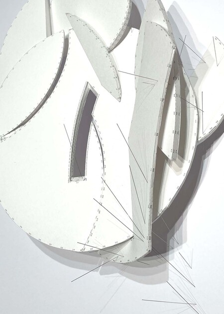 A.Q. The abstract topography series shows an authorial study of the interaction of the two main components included in the objects: territory and form. The material, and the use of architectural modeling techniques in the facilities, create an associate series of museum-related, research-related, white monochrome, ice-antarctic continent-Antarcticides. The contrasting combination of paper and steel reinforces such characteristics as fragility, extremeness.