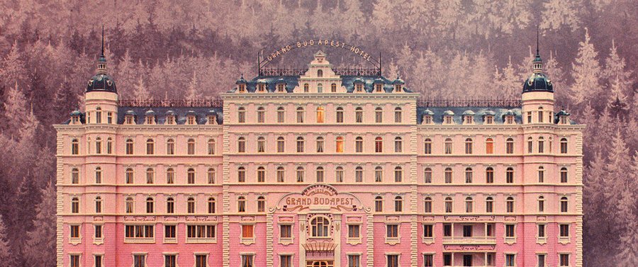 В фильме «Отель Гранд Будапешт» преобладают розово-красные оттенки. Это создаёт ощущение сказочности. Нежный розовый цвет, который является «визитной карточкой» фильма, можно увидеть в сценах любви и привязанности. Интерьер отеля в основном выполнен в красных тонах, а костюмы персонала имеют насыщенный фиолетовый цвет. Такое сочетание продолжает линию сказочности и гротеска. Красный цвет символизирует огонь, страсть и любовь, а фиолетовый — мистичность и аристократизм.