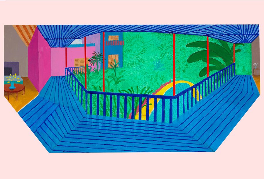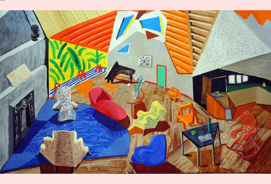 «Большой всплеск», 1967; «Поливалка», 1967; «Интерьер с лампой», 2003; «Интерьер побольше с голубой террасой и садом», 2017; «Интерьер студии № 2», 2017; «Большой интерьер, Лос Анджелес», 1988, Д. Хокни